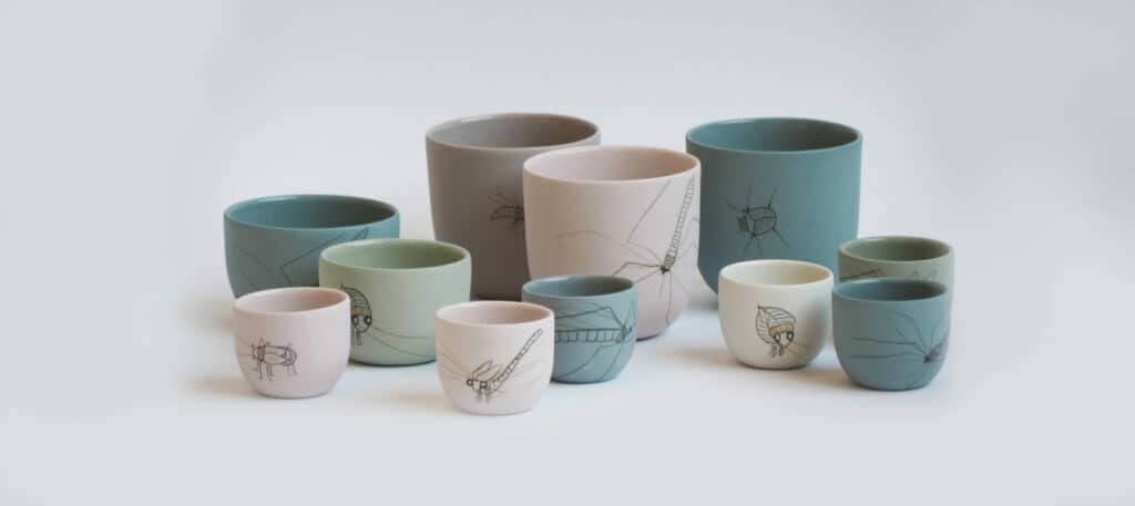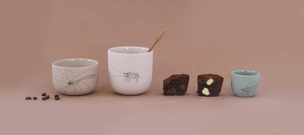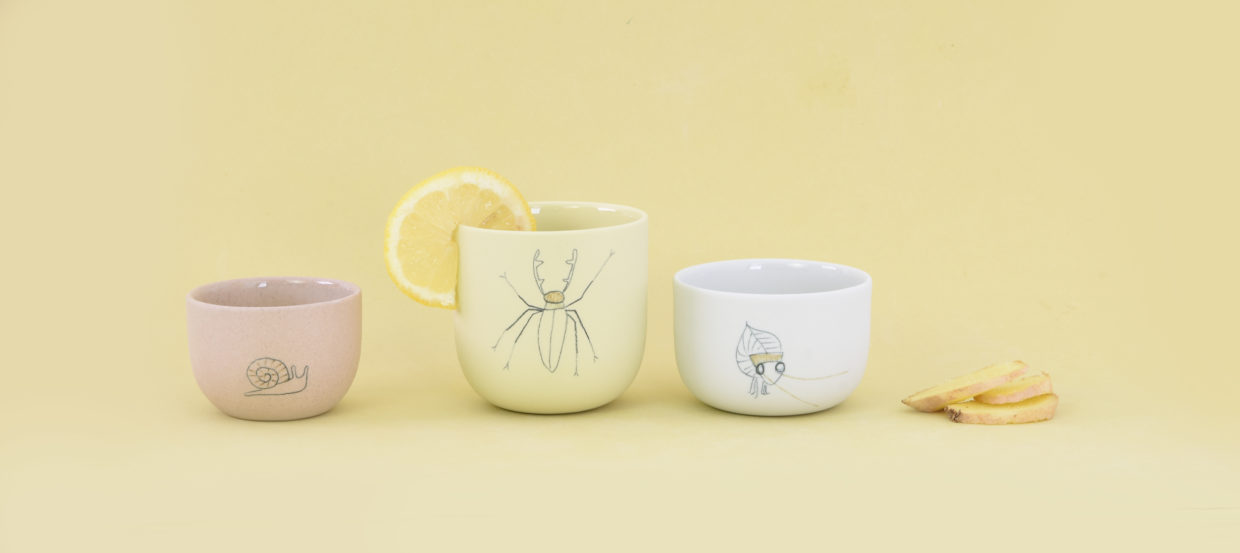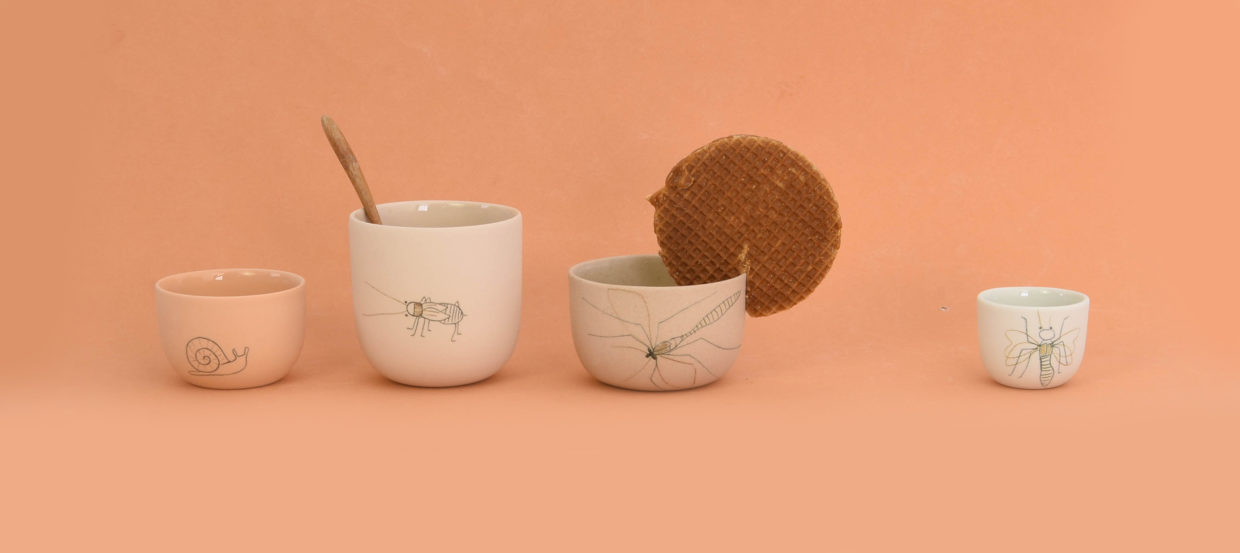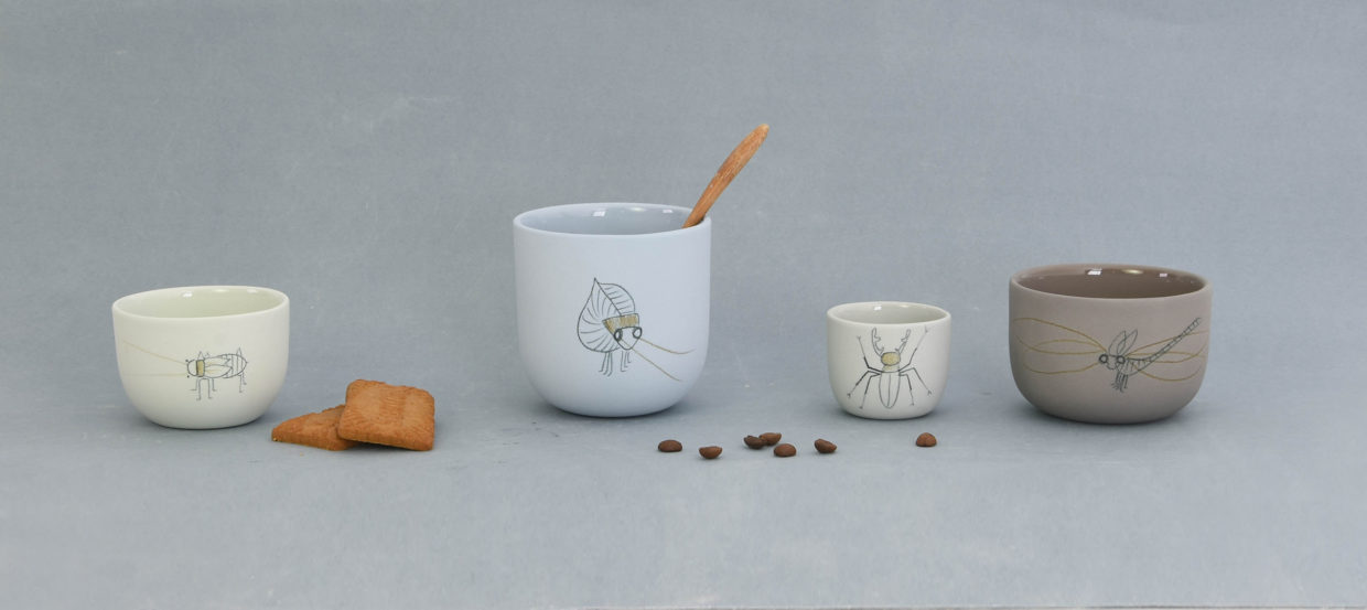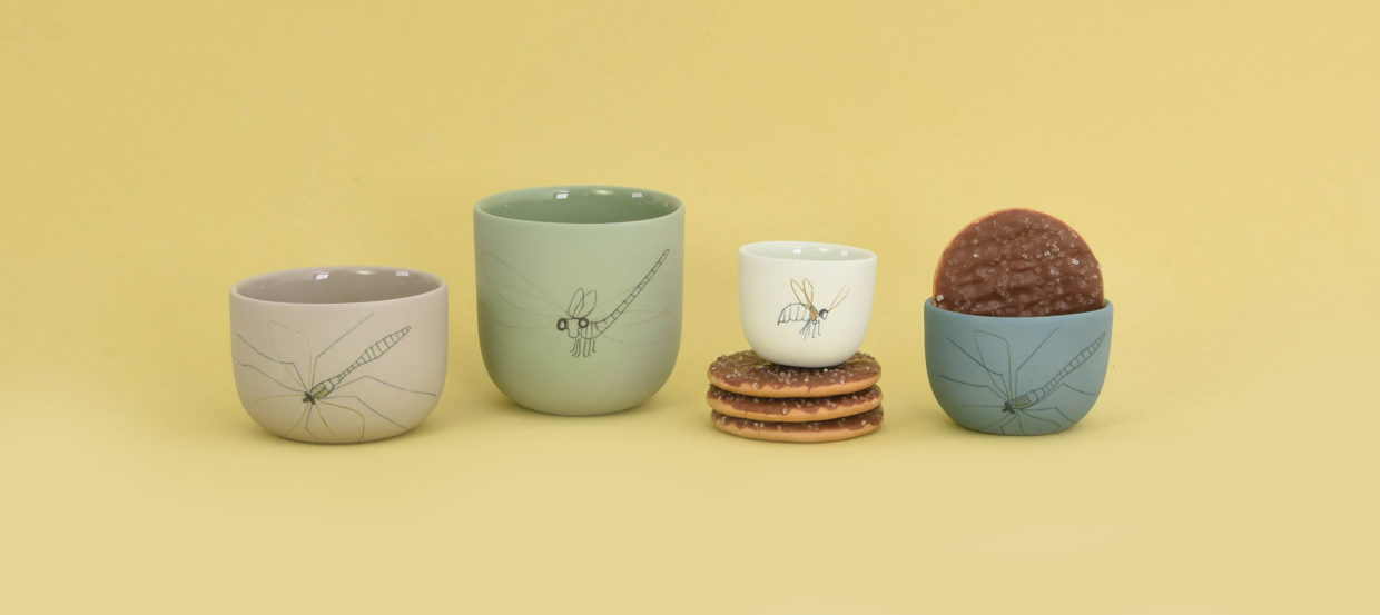 A sunny day, a full picnic basket and the occasional close encounter with nature. Small insects and animals that curiously inspect your plate or cup. That serene feeling of having a picnic, with your bare feet tickled by grass, is translated to the dining table at home with this insect tableware. Dragonflies, beetles, tiny spiders. Illustrations of these innocent creatures are drawn by hand on the cups and plates. The tableware is available in different sizes, colors and alive with that outdoor feeling thanks to the little drawings.